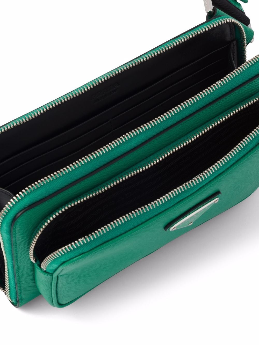 • Prada uses the house’s signature Saffiano leather to construct this dark green bag, adorned with a recognizable triangle logo at the front and complete with a zipped compartment for a utilitarian appeal. Finished with industrial-inspired silver-tone hardware, this SS22 accessory can be worn across the body or on the shoulder thanks to its adjustable strap.