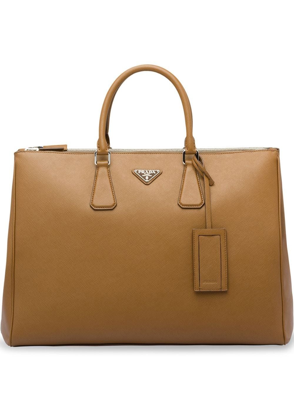 Miuccia Prada’s desire for ‘humanity, simplicity and reality’ reigned supreme during the label’s stellar runway collection. This cinnamon brown Saffiano leather tote bag from Prada features round top handles, a detachable shoulder strap, a hanging leather tag, silver-tone hardware and a triangular metal logo on the front.