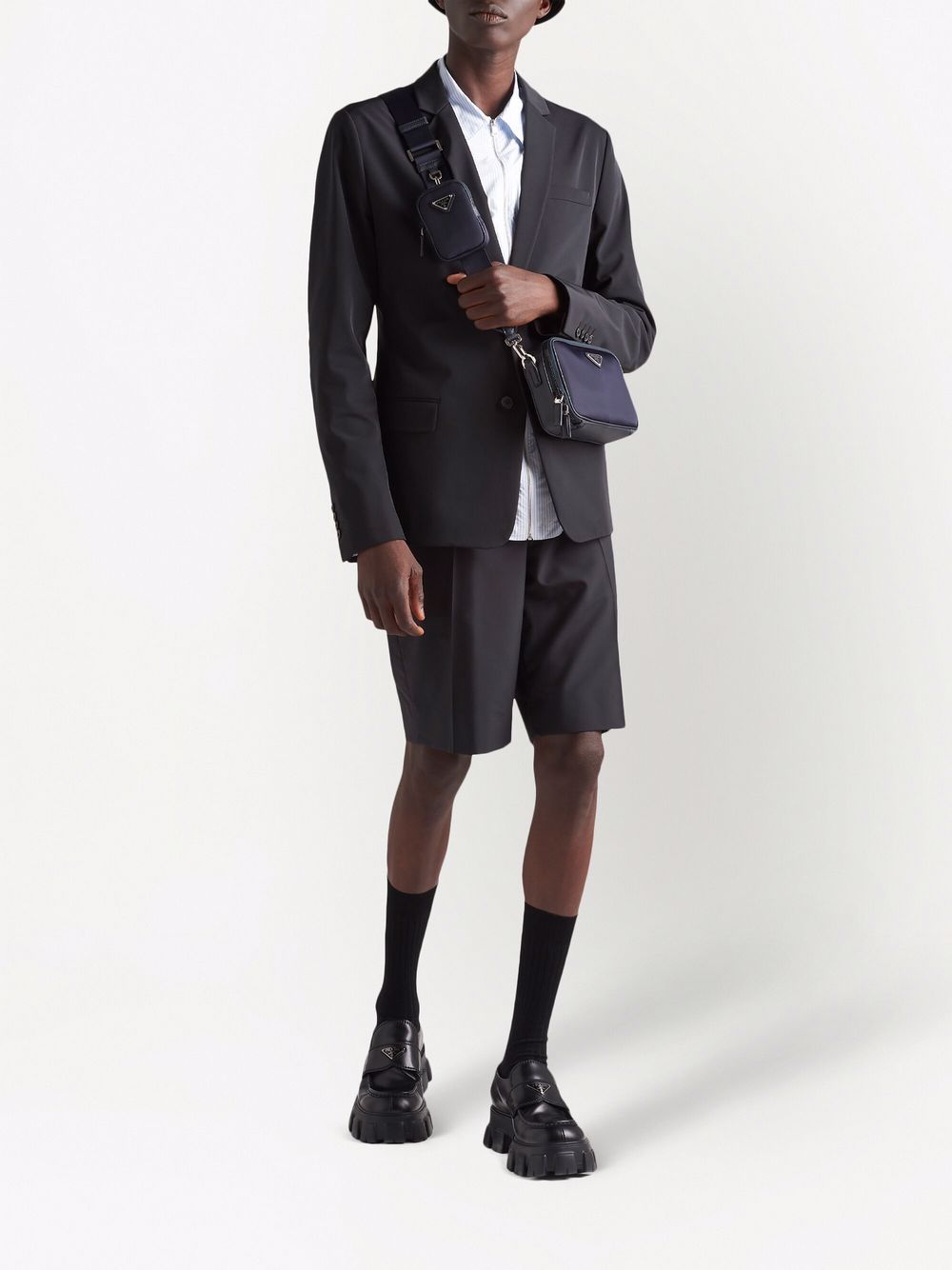 • Prada pairs sleek and practical styles with this Brique shoulder bag. Finished in a versatile navy hue, it boasts the brand’s signature removable pouch for a contemporary finish.