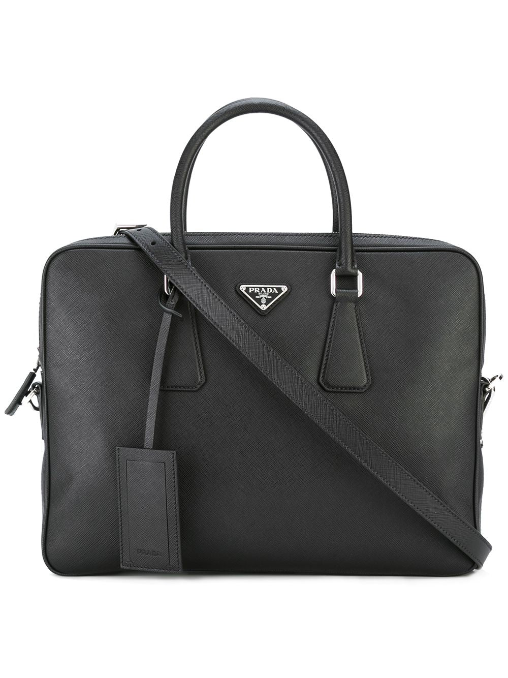 black leather Saffiano leather enamel triangle logo leather tag silver-tone hardware top zip fastening two top handles adjustable detachable shoulder strap main compartment
