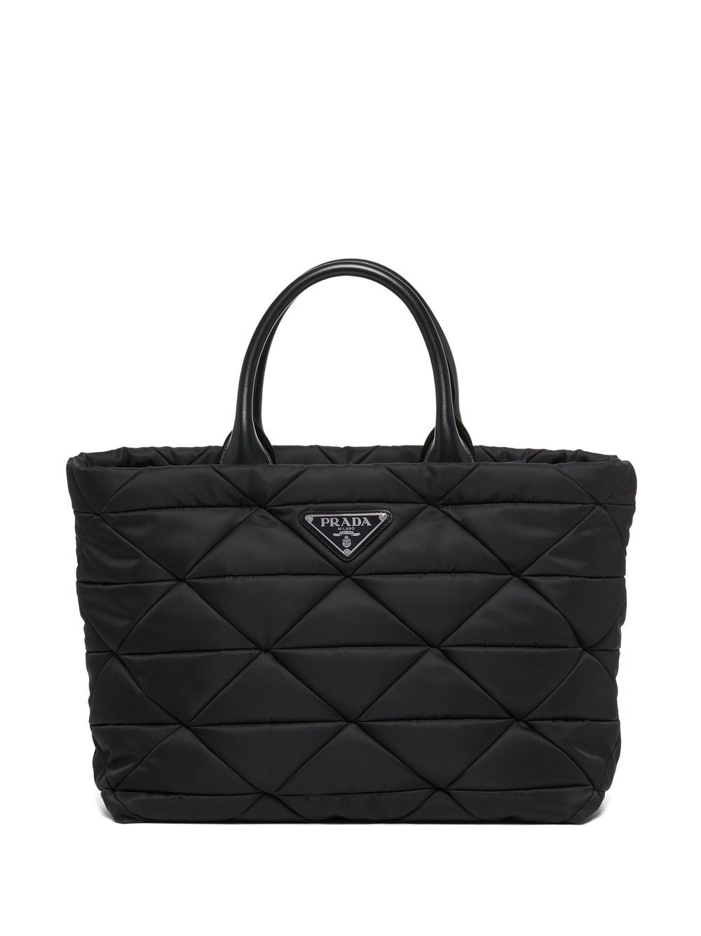 Prada solidifies the importance of its iconic triangular emblem in this leather tote bag design. Crafted from smooth black calf leather in a carryable rectangular shape, the petite tote bag offers the brand’s signature motif in its classic enamel plaque form and subtle embossed technique.