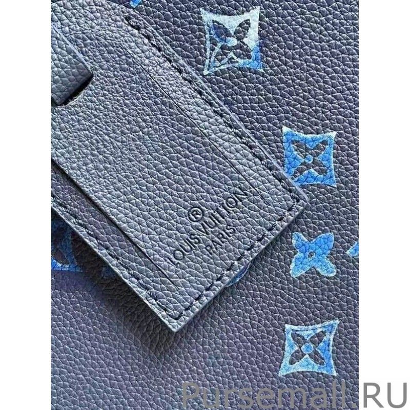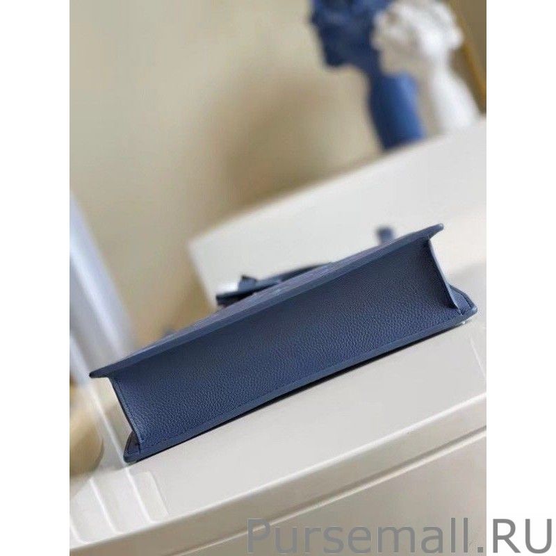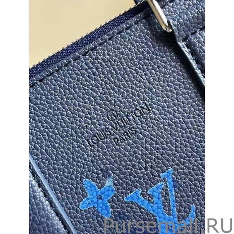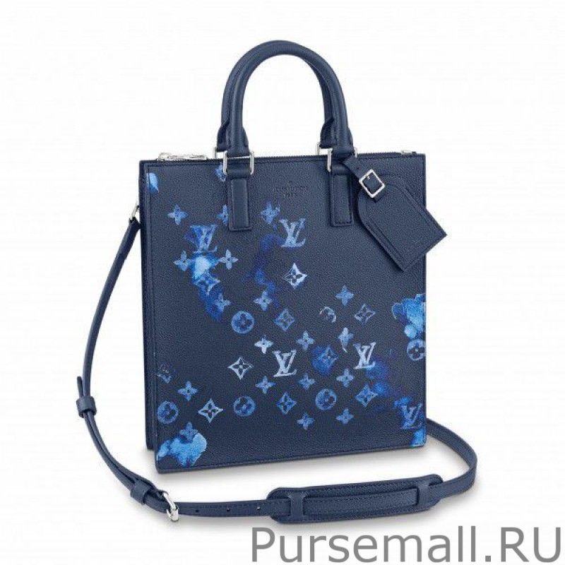 Made from navy blue grained leather, the distinctive Sac Plat Zipp鑼?bag features a lightblueandwhite Monogram print with a watercolor feel. Two top handles and a removable shoulder strap complete the vintageinspired design. The uneven print brings a personalized feel to the bag.