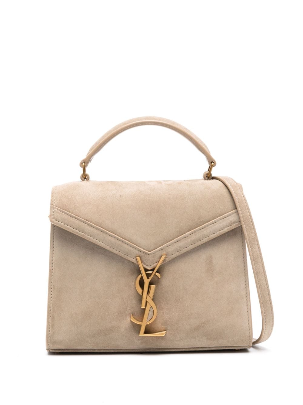 Saint Laurent’s beige Cassandra bag is named after the graphic artist who created the iconic YSL logo in 1961 – the moniker doubles as the clap at the envelope flap in both decorative and functional detail. It’s crafted to a structural silhouette from supple suede with a top handle and matching shoulder strap for adaptable wear.