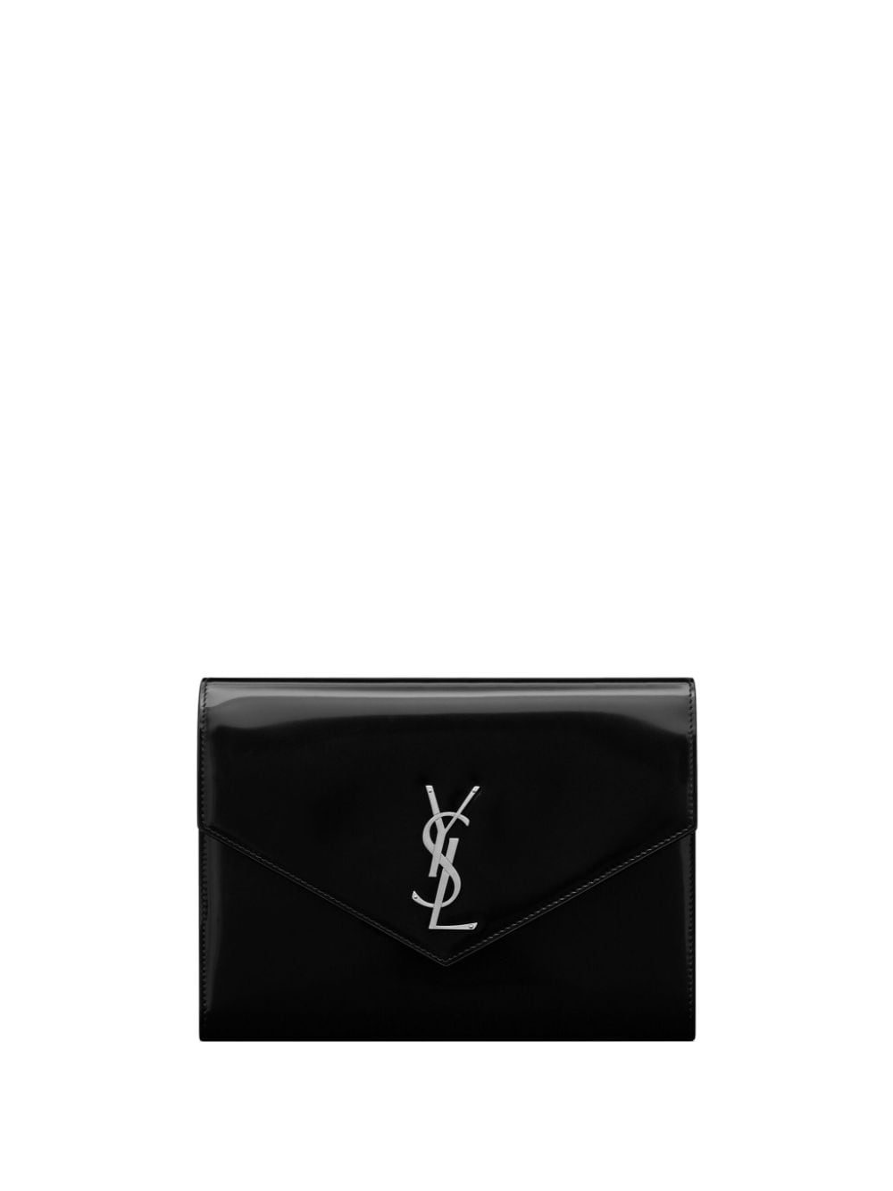 • Uniting two brand icons, Saint Laurent presents this black clutch bag. Crafted from glossy calf leather, it boasts a signature envelope design that is equally sleek and practical. It is punctuated with the brand’s iconic Cassandre logo, designed in 1961 by Adolphe Jean Marie Mouron under his pseudonym, which gives the layered symbol its name.