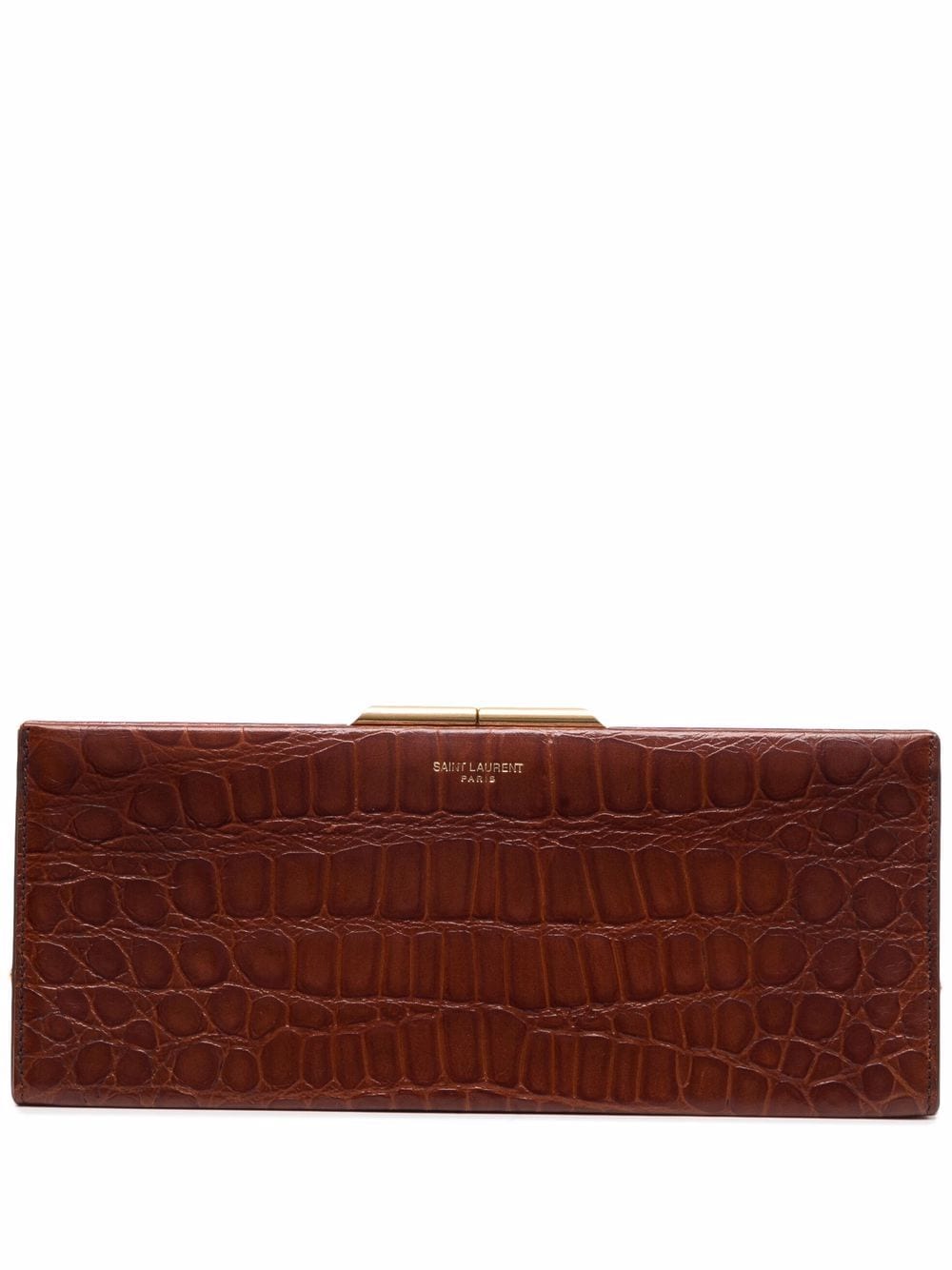 Brown leather crocodile-effect clutch bag from SAINT LAURENT featuring crocodile effect, padlock fastening, engraved logo, gold-tone hardware and internal logo patch.