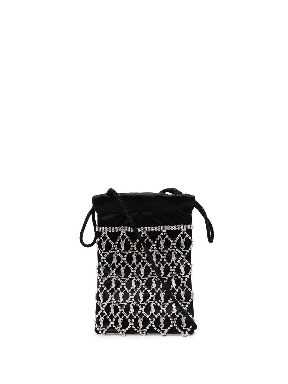 Crafted with a satin finish, this drawstring mini bag from Saint Laurent is decorated with the brand’s YSL logo all over adorned with crystal embellishments. The dazzling accents stand out against the piece’s black background.