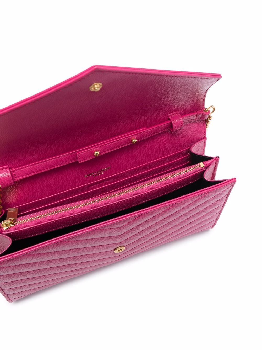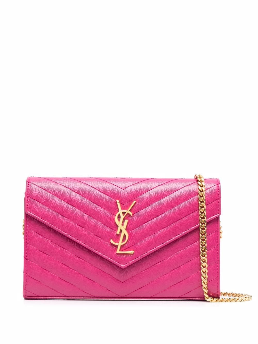 • Embellished with Saint Laurent’s most recognizable motif, its YSL monogram plaque, this wallet-on-chain is part of the House’s AW21 collection and is crafted from pebbled leather. In a fucshia pink shade, this practical accessory is finished with refined gold-tone hardware and a detachable chain-link strap that allows it to be worn crossbody style, on the shoulder or handheld.