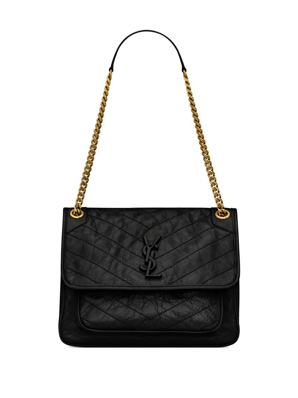 • Niki logo-lettering shoulder bag from SAINT LAURENT featuring black, gold-tone hardware, logo lettering, tonal stitching, foldover top with press-stud fastening, chain-link shoulder strap and main compartment.