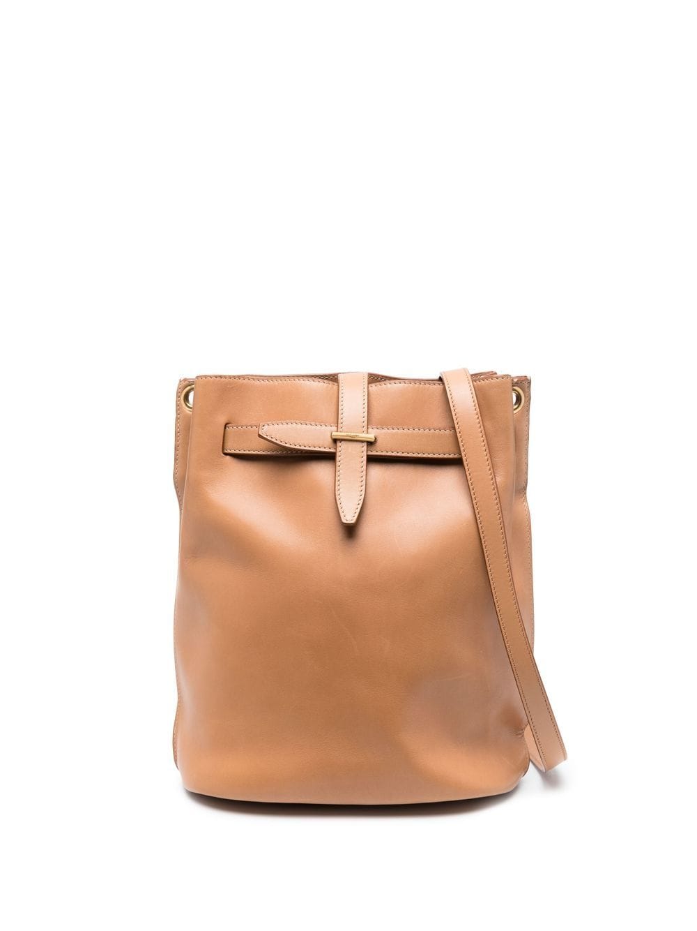 Saint Laurent refines the classic bucket bag with this iteration. In toffee beige leather, the minimal detailing comprises thin straps across the top and sides.