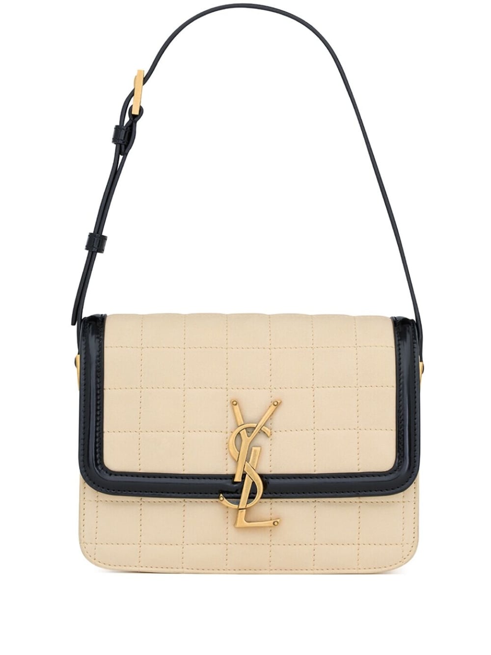 Named after a small town in Italy’s Lombardy region, Saint Laurent’s Solferino bag is characterised by its vintage-inspired quilted design. Part of the SS23 collection, this neutral iteration is trimmed with black leather and suspends from an adjustable shoulder strap. The Cassandre logo fastening appears front and centre, rendered in gold-tone metal.