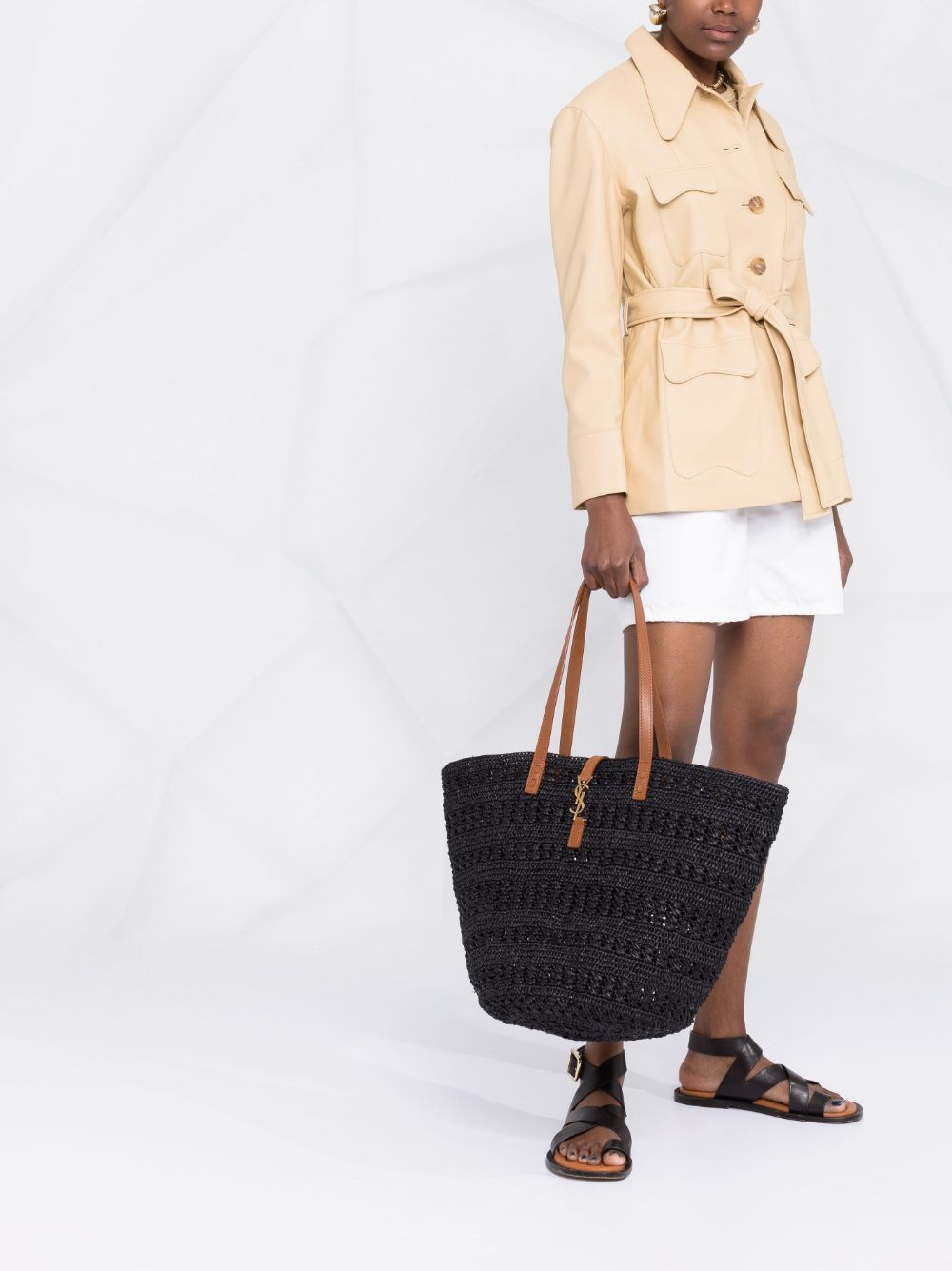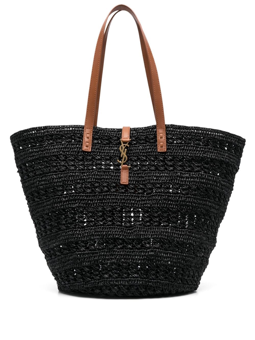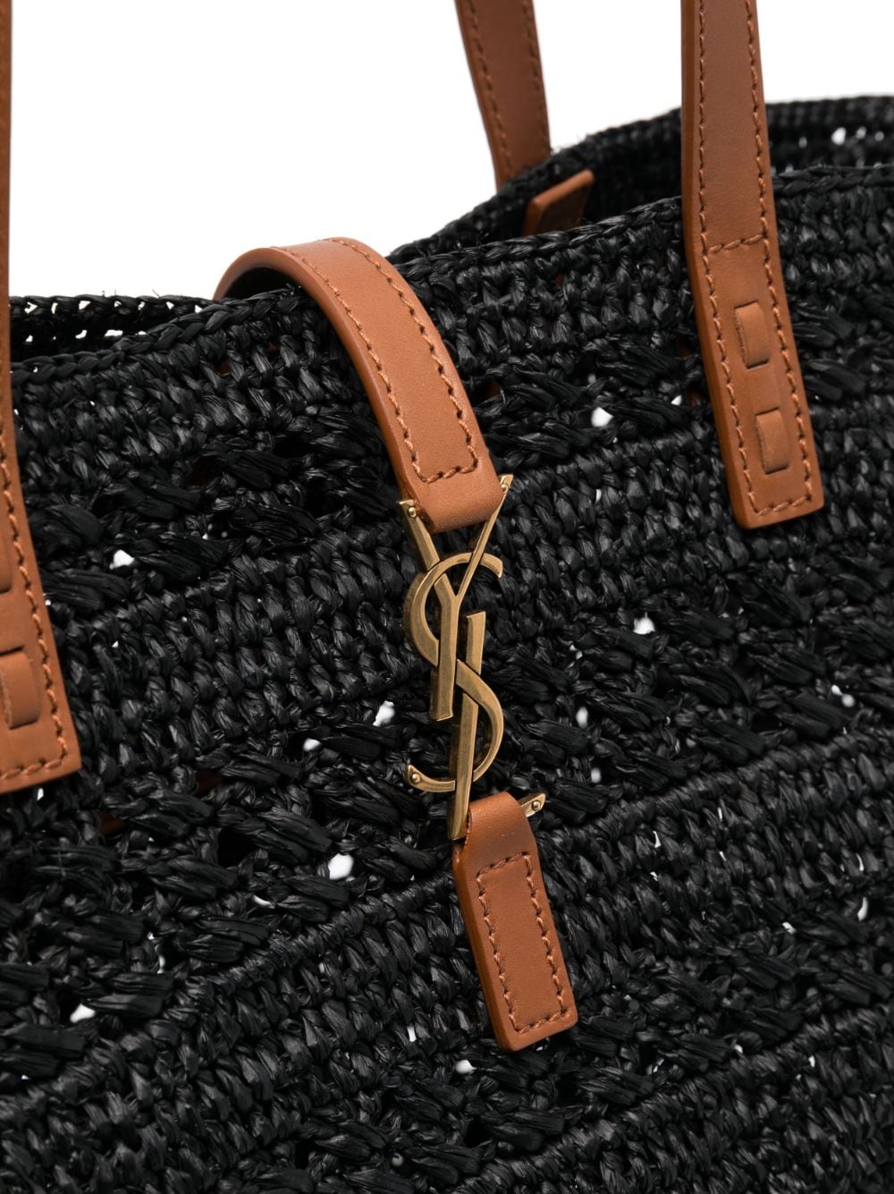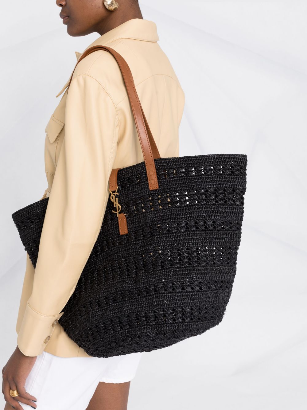 In a black raffia design, this tote bag is accented with contrasting top handles in brown leather. The accessory is given a signature look thanks to an iconic YSL plaque, seen to the front.