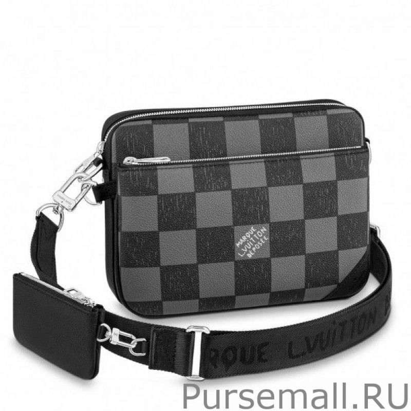 This Trio Messenger bag is made from cowhide leather with a blackandgray Damier checkerboard pattern in which the black squares seemed to have been penciled in on the leather. The Trio combines a large main compartment, a removable zipped pocket, and a separate coin purse attached to the strap.