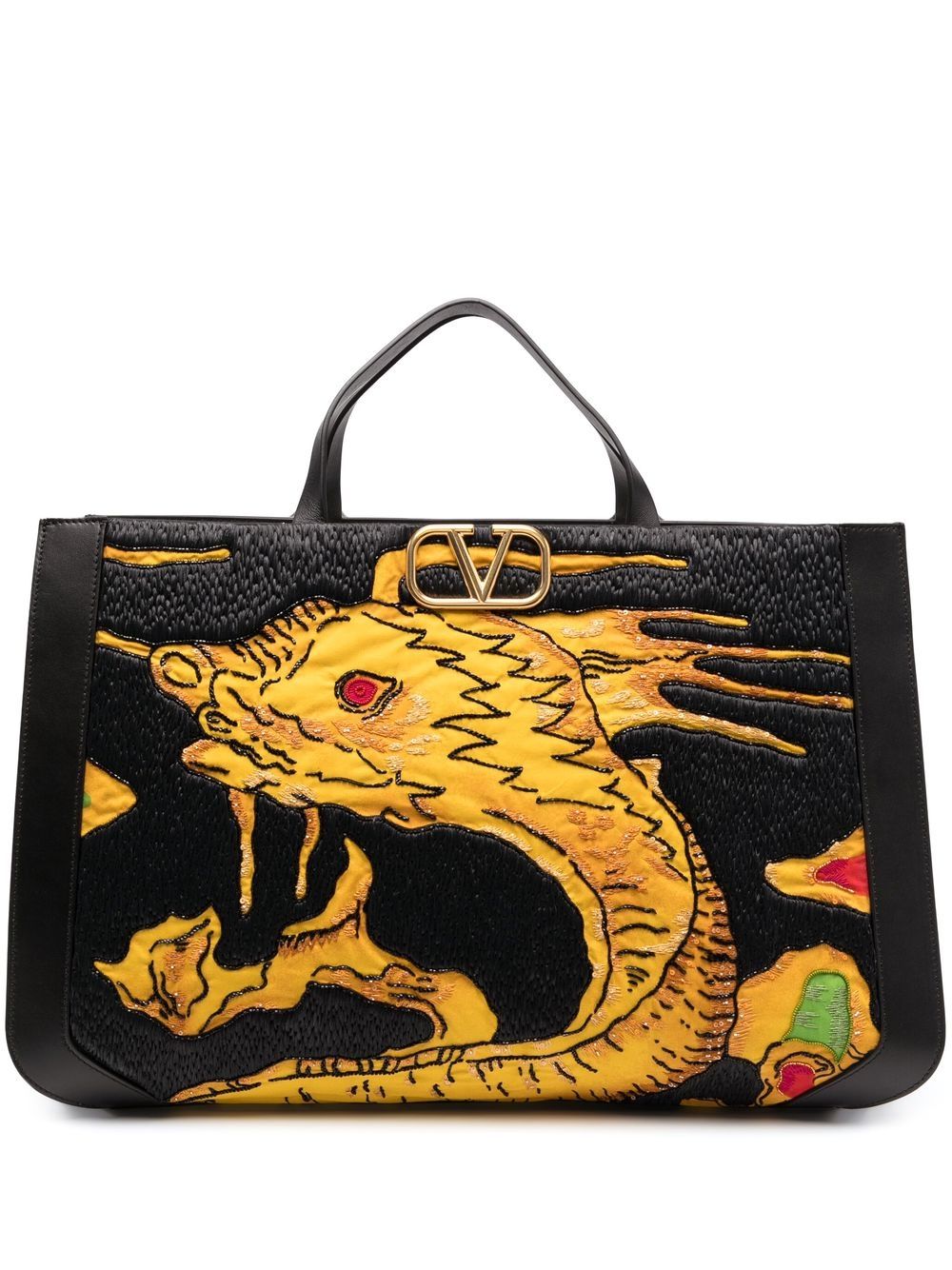 Showcasing a Re-Edition of a signature style, this spacious tote bag from Valentino Garavani is designed with a raffia front with a bead and sequin-embellished Drago embroidery to the front.