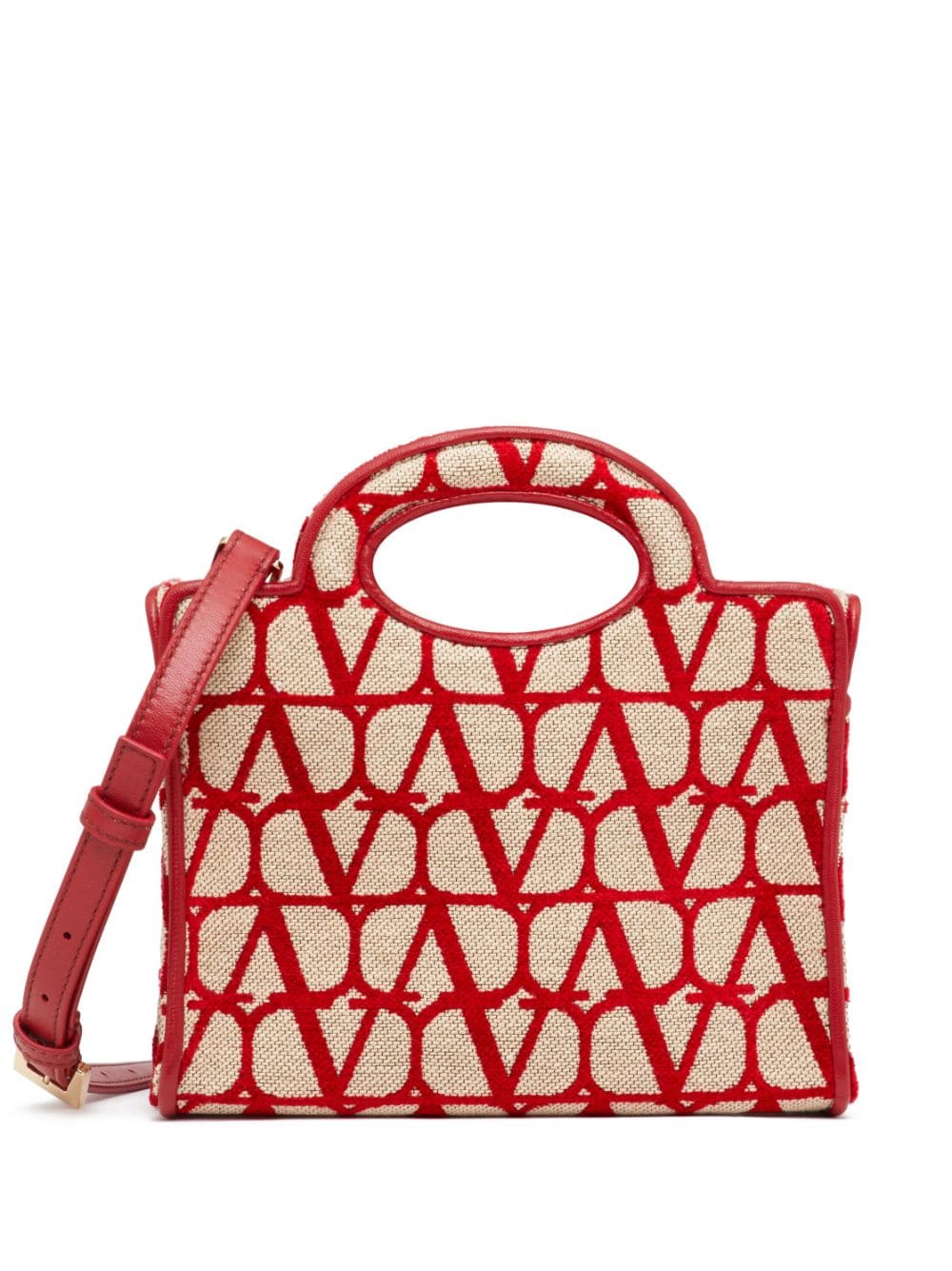 Le Troisième Toile Iconographe tote bag from VALENTINO GARAVANI featuring beige, red, cotton blend, goatskin, VLogo Signature, all-over logo embroidery, logo-embellished lining, leather trim, circular top handles, adjustable detachable shoulder strap, open top, concealed magnetic fastening, main compartment, internal patch pockets, platinum-plated hardware and zip-fastening pouch pocket.