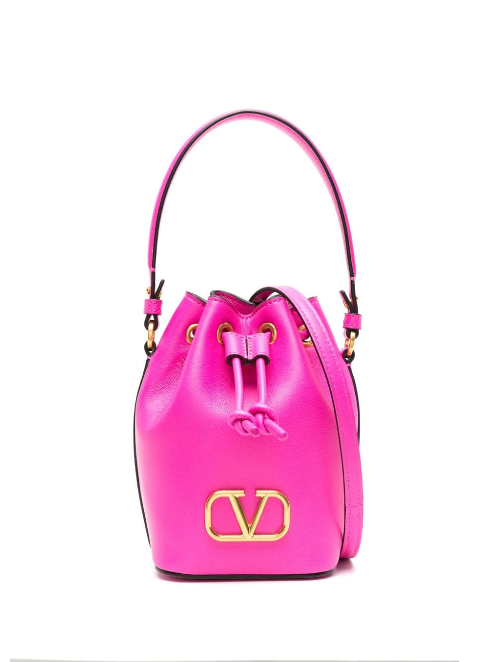 Presented in micro size, this bucket bag by Valentino Garavani is crafted from smooth leather and rendered in a vibrant shade of pink. Featuring a drawstring fastening and main compartment, the classic silhouette is highlighted with a gold-tone VLogo plaque at the front.