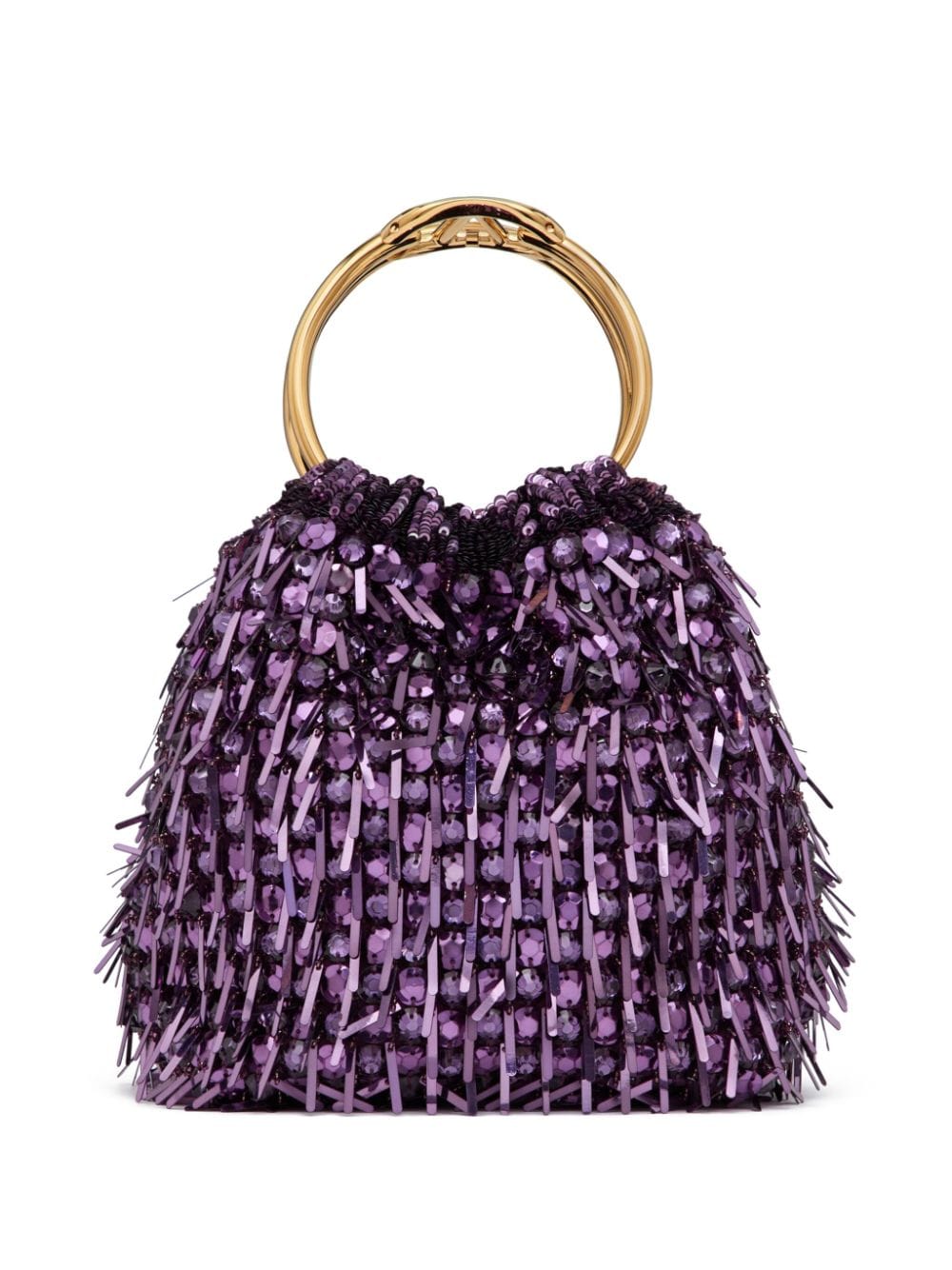 Valentino Garavani adds to its edit of high-octane bags with this amethyst-purple tote. Its soft and slouchy silhouette is fully embellished with scores of crystals and swishy paillettes with dense clusters of sequins at the top flap. The VLogo fastening at the gold-tone bracelet handles acts in branded and functional detail.