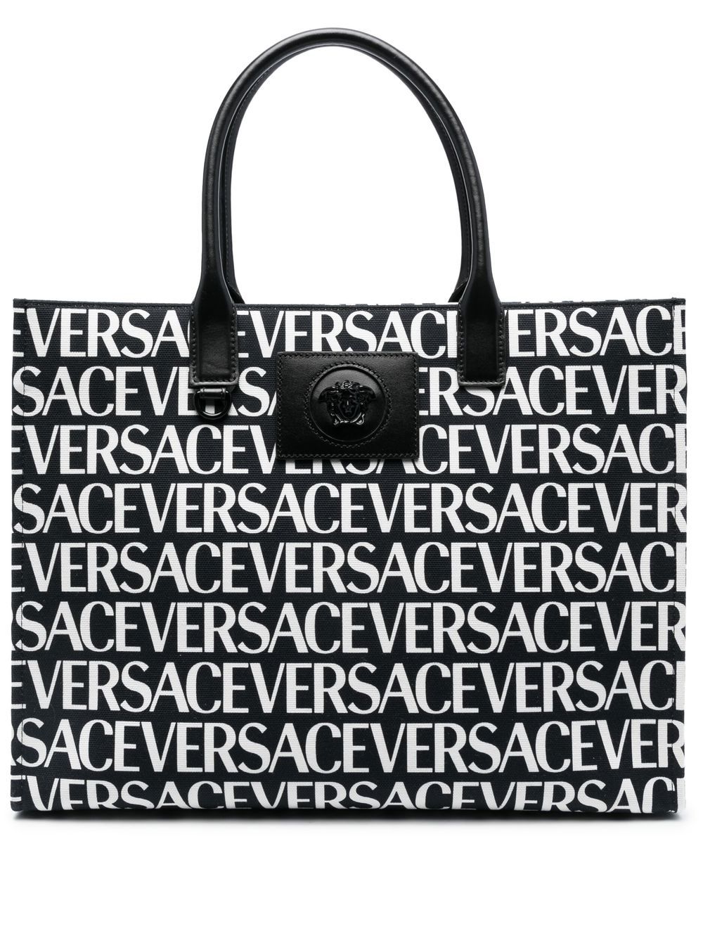 all-over logo-print tote bag from Versace featuring black/white, calf leather, cotton, all-over logo print, debossed logo to the front, two top handles, press-stud fastening, internal zip-fastening pocket and main compartment.