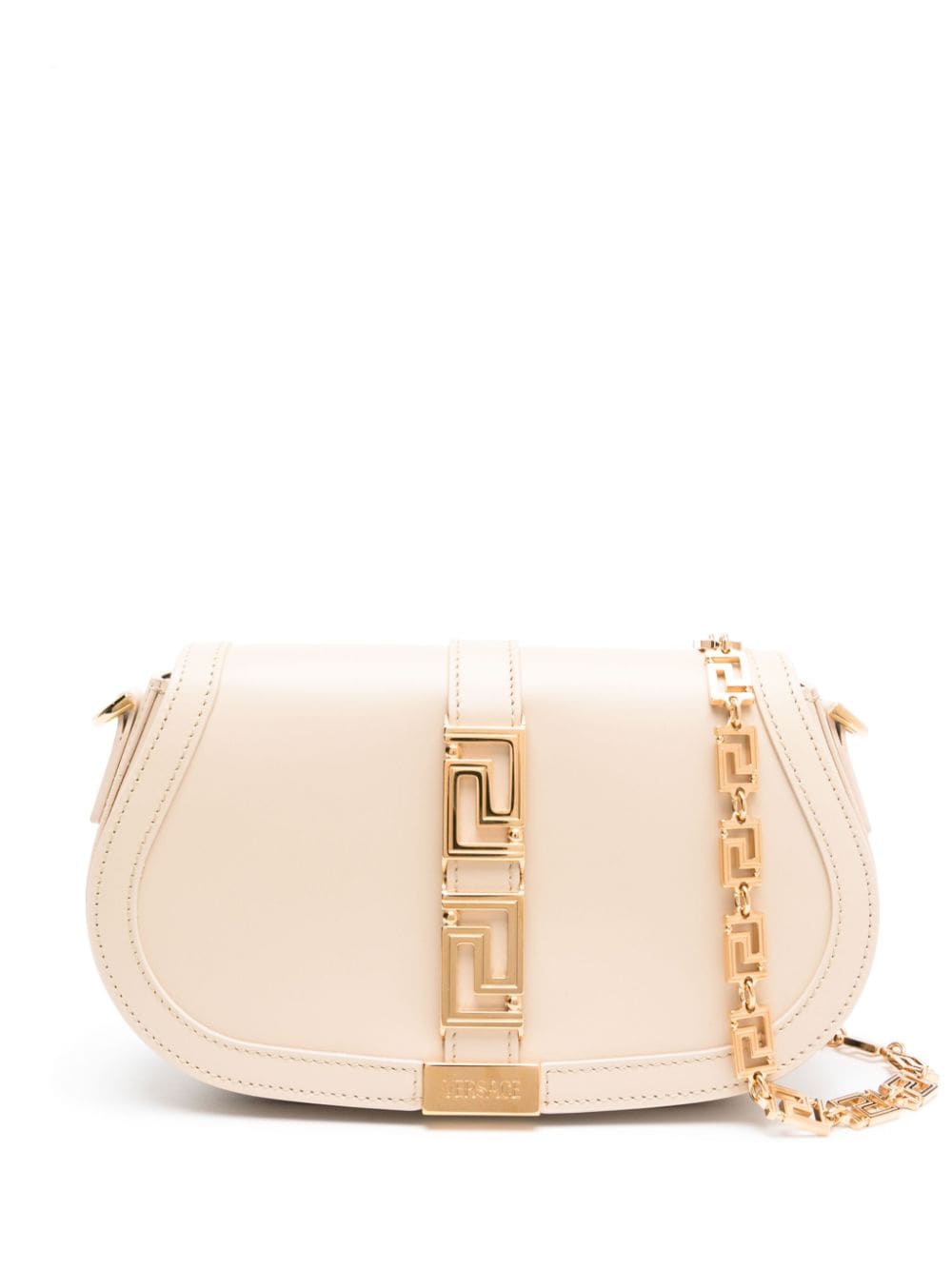 Versace’s blush-beige Greca Goddess shoulder bag is named after the meandering shape of the gold-tone links at the front flap and shoulder strap.