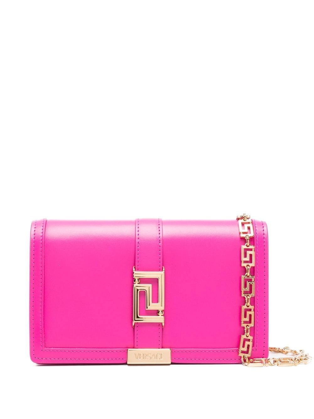 Versace injects this mini bag with its signature high-octane aesthetic. It’s made from fuchsia-pink leather, embellished with gold-tone logo hardware and fitted with a Greca chain-link shoulder strap – a brand hallmark.