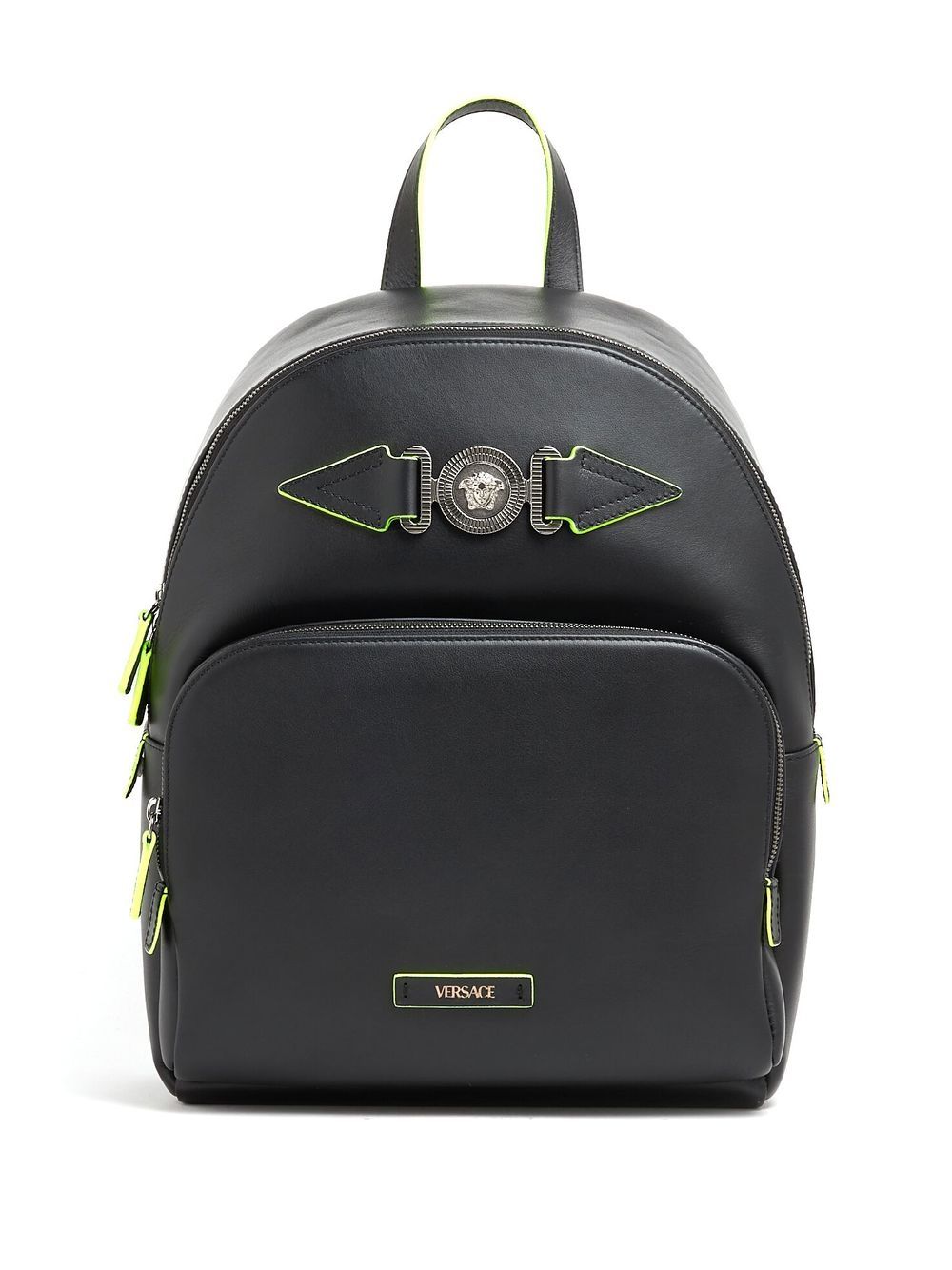 Medusa Biggie backpack from Versace featuring black, leather, Medusa plaque detail, two adjustable shoulder straps, single top handle, all-around zip fastening, front zip-fastening pouch pocket, main compartment and internal padded laptop pocket.