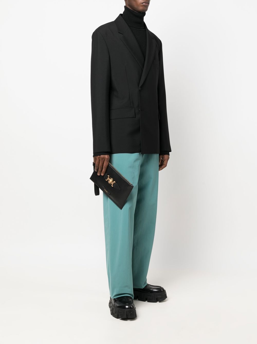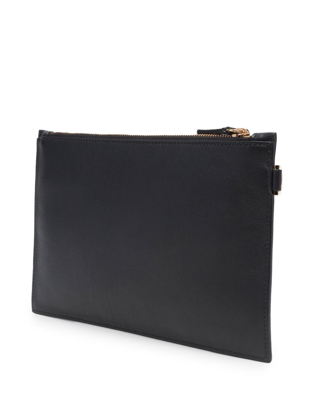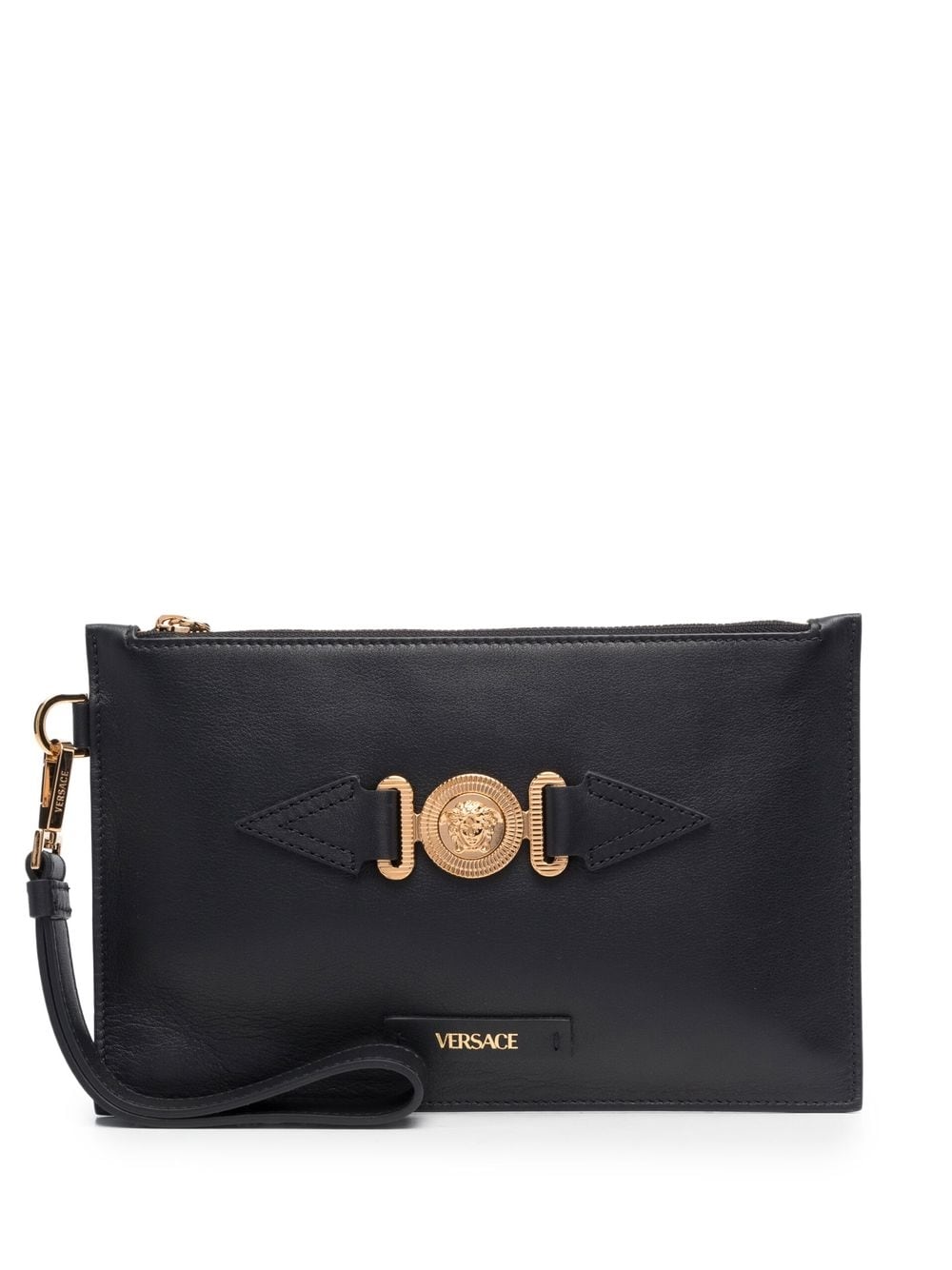 Medusa Biggie small pouch bag from VERSACE featuring jet black, leather, Medusa plaque detail, gold-tone logo lettering, main compartment, top zip fastening, single card slot and wrist strap.