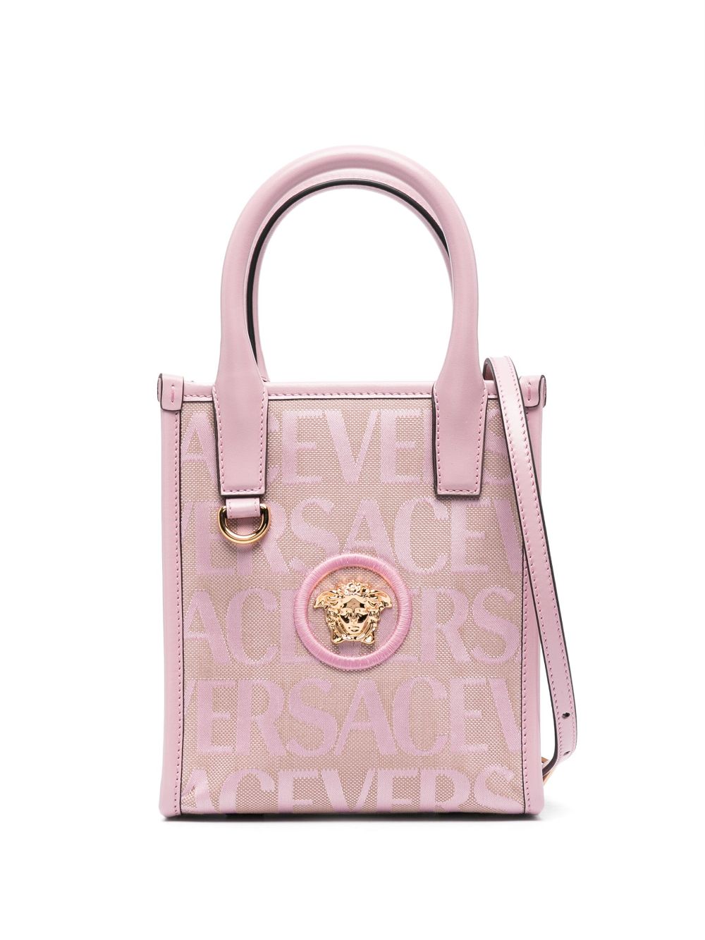 Versace showcases its affinity for bold branding with this mini tote bag. Crafted in Italy from baby-pink canvas with leather trimming, its rectangular construction is decorated with a tonal logo-jacquard motif and a central Medusa head in polished gold-tone hardware.
