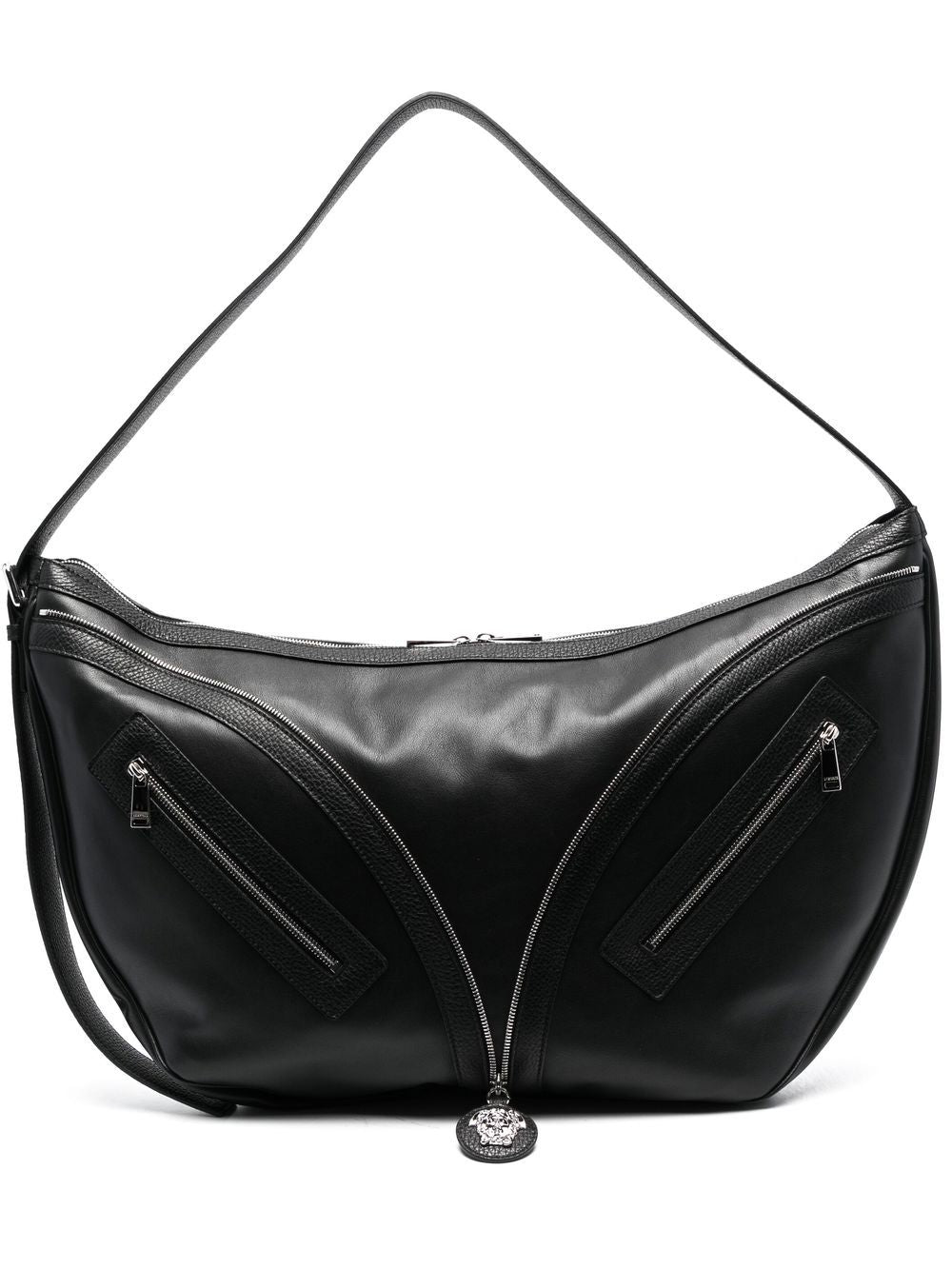 Repeat large shoulder bag from Versace featuring black, calf leather, cotton, Medusa plaque detail, buckle-detail shoulder strap, adjustable shoulder strap, top zip fastening, main compartment and internal zip-fastening pocket.