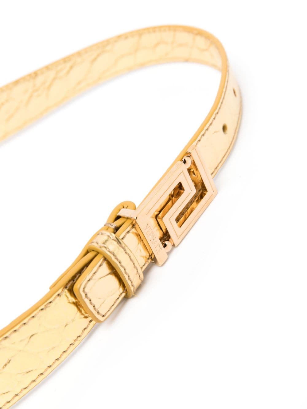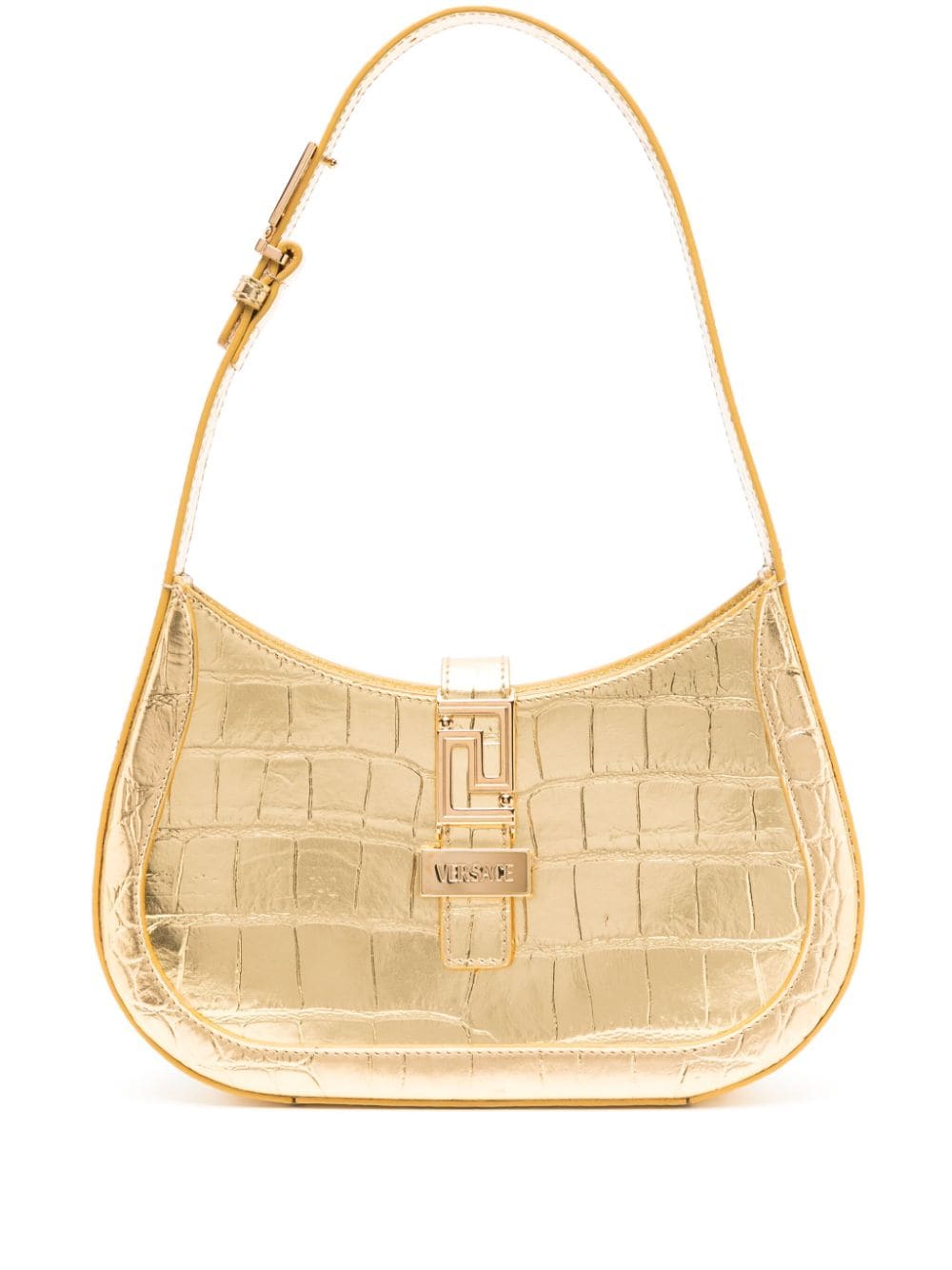 Versace’s shoulder bag honours heritage codes with its gleaming gold-tone hardware featuring the iconic Greca motif. The streamlined silhouette is crafted from metallic crocodile-effect leather and is equipped with a practical adjustable handle.