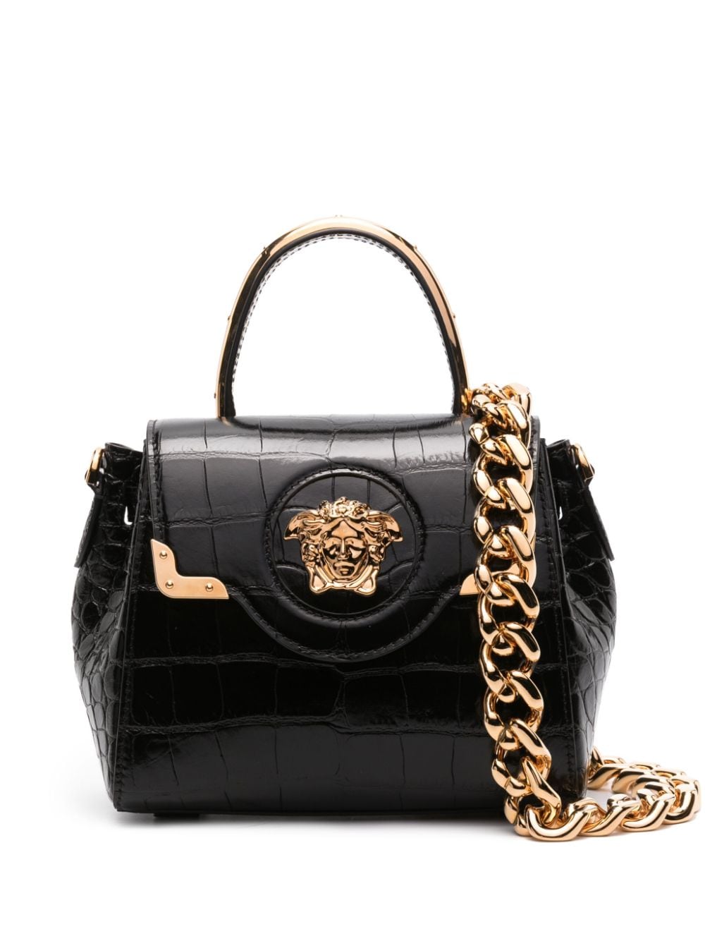 Versace reinterprets a brand icon with this black La Medusa tote bag. Retaining the style-defining structured silhouette, this iteration is crafted from smooth, crocodile-embossed leather punctuated by gleaming gold-tone hardware, including a chain-link shoulder strap and Medusa Head motif at the centre.