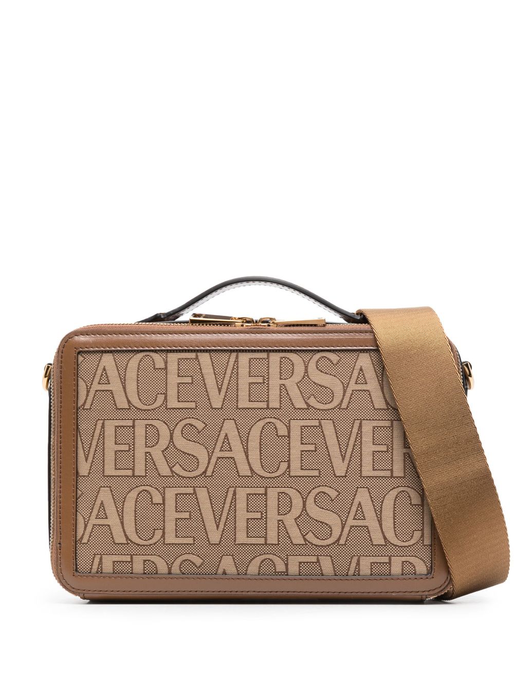 Versace’s seasonal Allover logo motif adorns this brown-hued canvas messenger bag in a tonal jacquard effect, lending an instantly recognisable look. It boasts a structured, rectangular design with a single top handle and a detachable shoulder strap allowing for varied styling options.