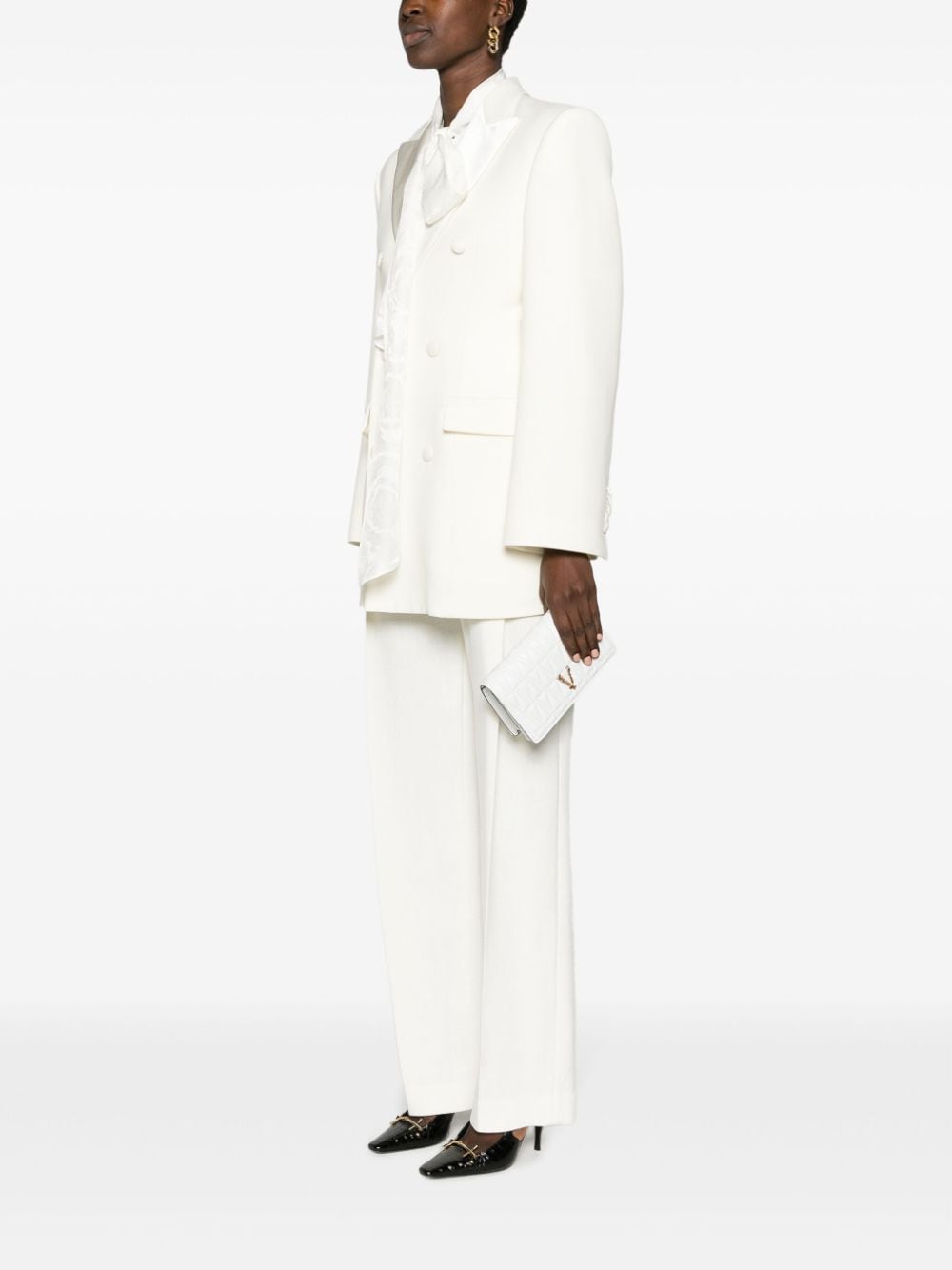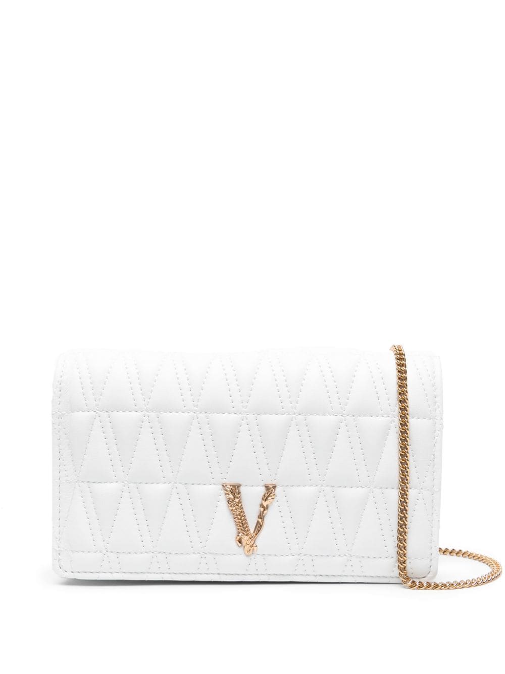 Versace’s shoulder bag is the newest addition to the enduring Virtus line. It’s crafted from white quilted leather to a compact silhouette and punctuated with a central gold-tone V plaque surrounded by acanthus leaves borrowed from the brand’s signature Barocco motif.